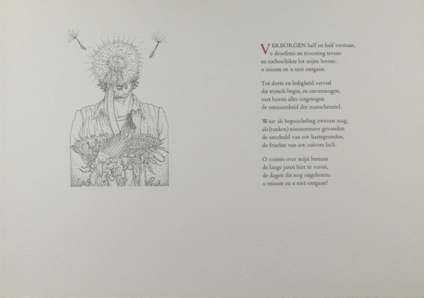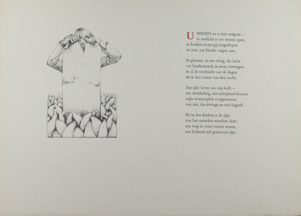 (Utrecht), Sub Signo Libelli, 1977. 7 eenzijdig bedrukte bladen in map (26 x 32,9 cm). 30 genummerde exx. Gesigneerd in colofon met initalen door Van Blommestein. Papieren rugschildje ontbreekt. Kleine oneffenheden aan map.