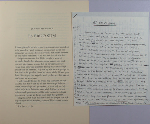l Es ergo sum werd geschreven als begeleidend woord bij Opus Gran van Harry Mulisch. Gepubliceerd bij wijze van hommage aan Harry Mulisch vanwege zijn aanweizgehis bij boekhandel Van Someren & Ten Bosch om De Aanlag te signeren.
